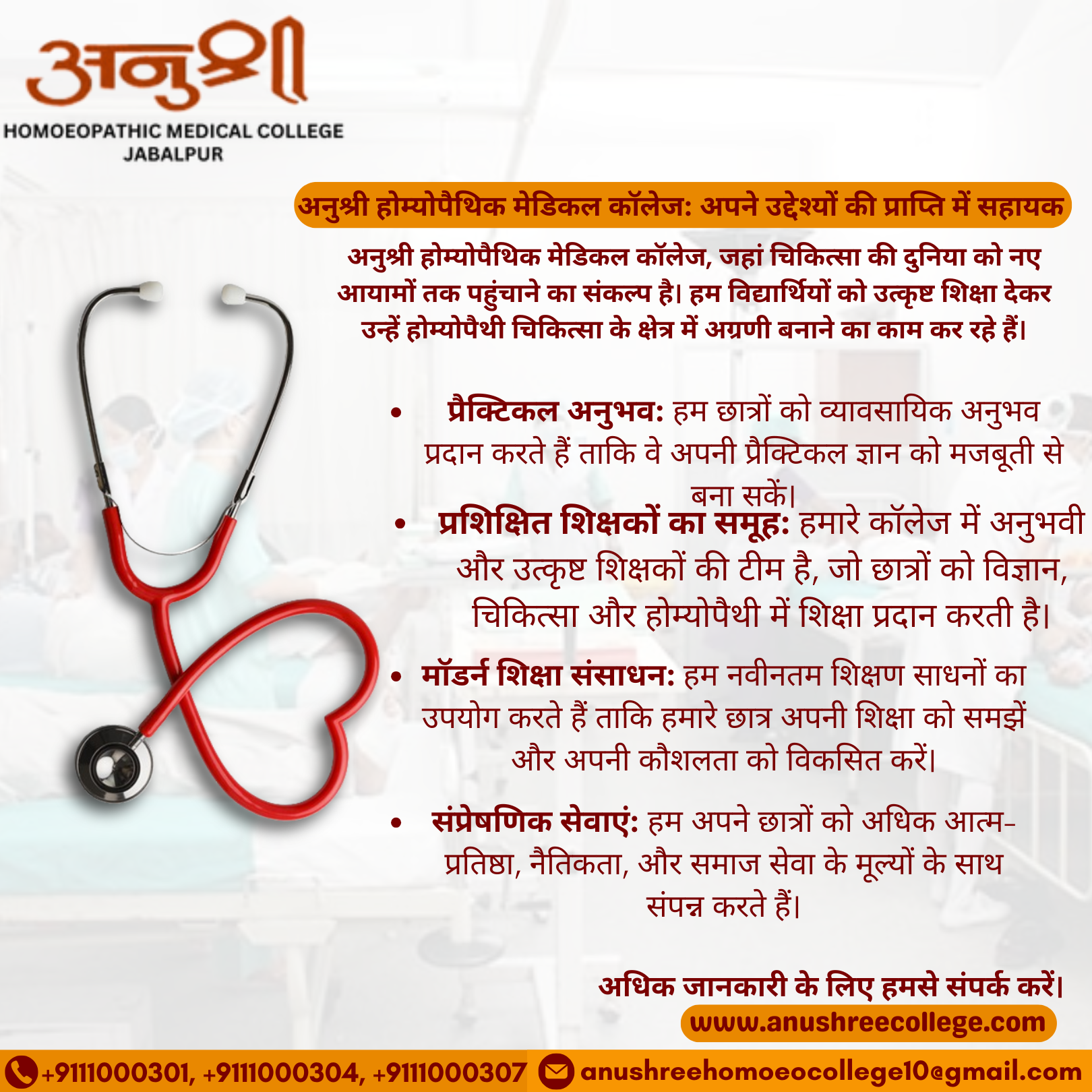 Located in the heart of Jabalpur, Anushree Homoeopathic Medical College & Hospital is a trusted name in holistic healthcare, dedicated to providing exceptional homoeopathic care through a patient-focused and scientifically rooted approach. With a team of highly qualified, compassionate doctors and specialists, we offer customized treatment plans tailored to individual needs, addressing not just symptoms but root causes. Our hospital provides comprehensive care for chronic illnesses, acute conditions, lifestyle-related disorders, skin and respiratory problems, and more.